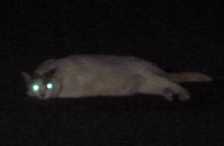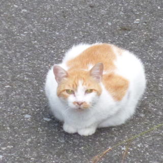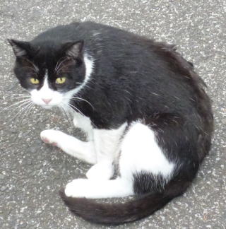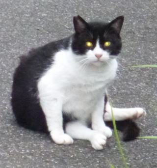 4.暑くて動けない妻達を撮るんじゃねぇと八割れ黒白猫。何て巨大な雄猫だ。