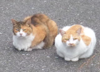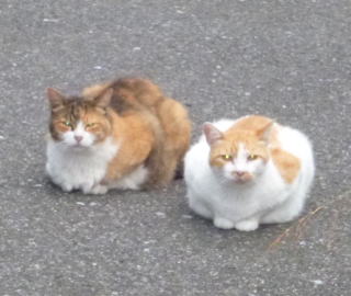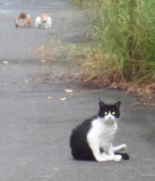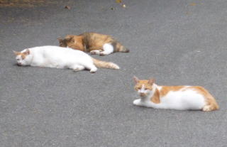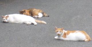 2.道路に横たわる三匹の雌猫。日本の夏は暑くて動けない。