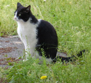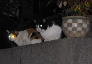 2.痩せて貧相な細子ちゃんと一緒に民家の玄関前の塀でパパを待つクーちゃん。
