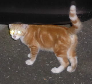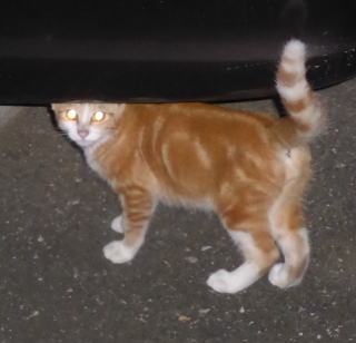 26.自宅の駐車場で自動車の下に隠れる茶珍獣ちゃん。