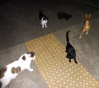 7.茶子ちゃん一派の猫の集会です。何故か茶珍獣ちゃんと泥棒猫の細子(本名は貧子)もいます。誰でも参加できるみたいですね。手前にいるのが黒猫三姉弟の(仮名)黒猫Aちゃんと(仮名)黒猫Bちゃんです。あなたはこの二匹を正しく識別できますか?。