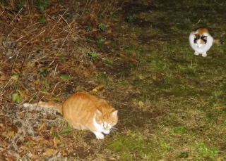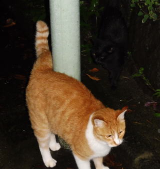親父猫同士のチャッピー君と茶太郎お父さんが寄り添って行進しています。何をしているのでしょうか?。人間に例えると酔っ払い親父同士が肩を組んで歩いている様なものでしょうか?。ちょっと違う気がします。