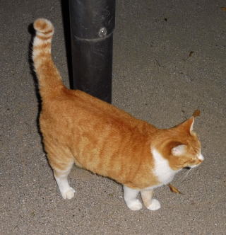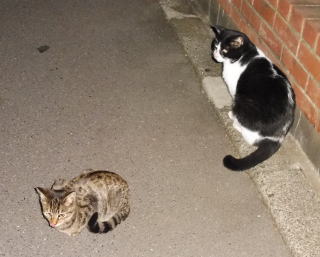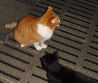 17.(仮名)キジ虎Cちゃんの横を通り過ぎ様としている(仮名)キジ虎Bちゃん。左側の方が(仮名)キジ虎Bちゃんで右側の座っている方が(仮名)キジ虎Cちゃんです。(仮名)キジ虎Bちゃんの特徴は平面的な顔立ち四角い眼鏡をかけた様な四角ばった目です。この他に(仮名)キジ虎Aちゃんがいるのだから識別が大変です。