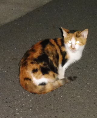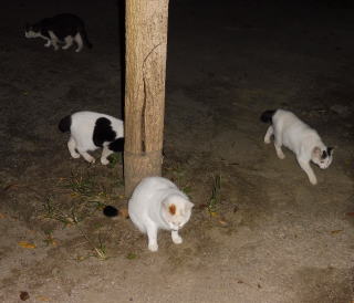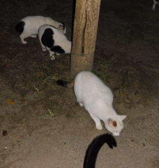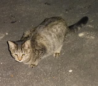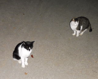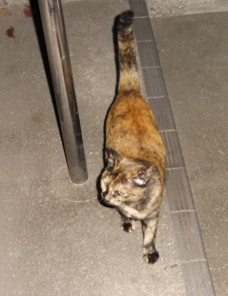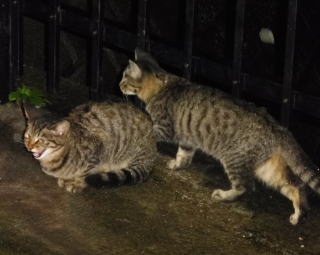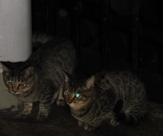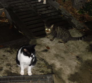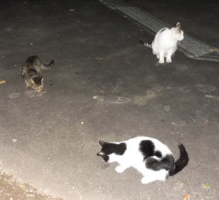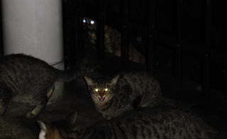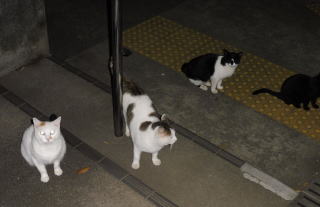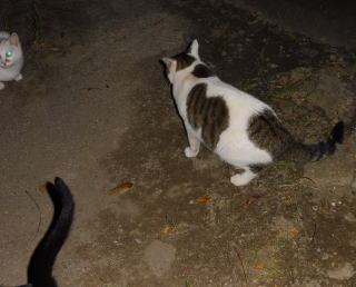 18.(仮名)キジ虎Bちゃんが通り過ぎてしまいました。手前はサバ子ちゃん。後ろの目の光ったネコちゃんはサビ柄ちゃんです。中央の(仮名)キジ虎Cちゃんはうるさいほど鳴き続けています。