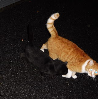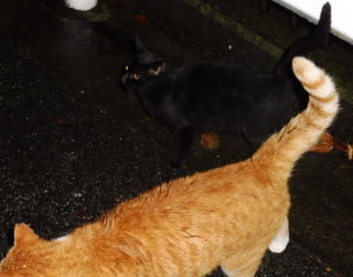 29.黒猫三姉弟の(仮名)黒猫Aちゃんが(仮名)キジ虎Bちゃんを見つめています。