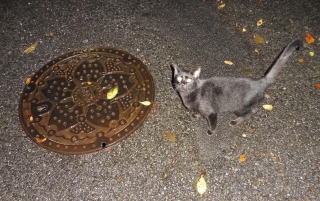 12.東京都・下水道のマン・ホールの前でパパを見上げる黒猫三姉弟の(仮名)黒猫Bちゃん。何故、五弁の桜に銀杏の葉なのでしょうか?。