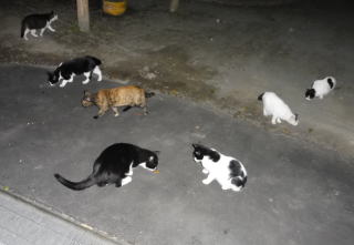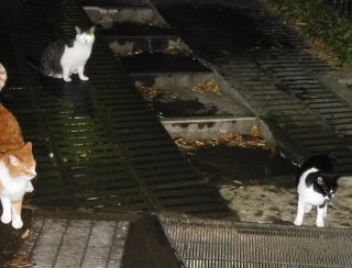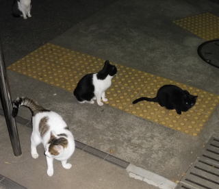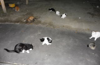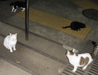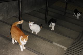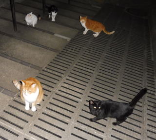 24.茶子ちゃん一派のネコの集会に対して最大の敵は九郎ちゃんではなく通行人です。通行人が通るたびにネコの集会は散り散りになります。昼間を支配している人間は夜は寝て出歩かない様にしよう。