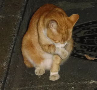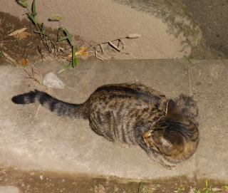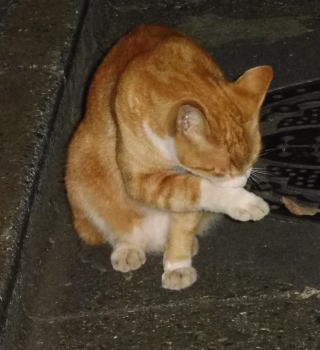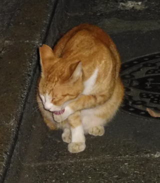 36.茶珍獣ちゃん。顔を洗っている場合じゃないぞ。九郎ちゃんが縄張りから一匹、追放すると茶子ちゃん一派が一匹増える関係にあります。