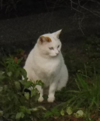 19.朝になると茶子ちゃん一派のネコの集会が終わり散り散りに去っていきます。しかし白三毛子ちゃんが残っていました。光学20倍(Panasonic Lumix DMC TZ57の場合、1倍は24mm広角レンズ、20倍は480mm望遠レンズに相当します)のズームで白三毛ちゃんを撮りました。