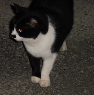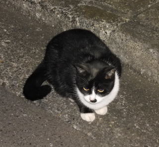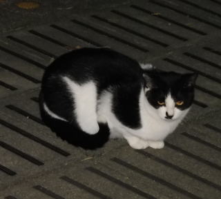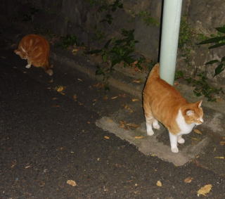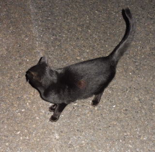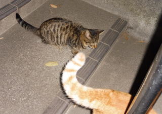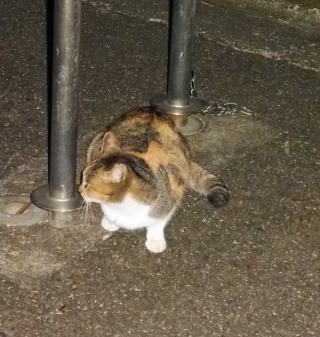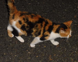 43.この三毛の子猫はどこからくるのか?家猫なのか?野良猫なのか?漆黒の闇の中でしか出会わないので良くわかりません。