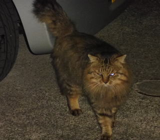 11.パパの自宅の駐車場で茶子ちゃん一派の副将の百合子ちゃんが警戒体勢をとっています。一体、どうしたのでしょうか?。