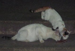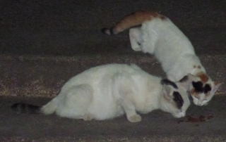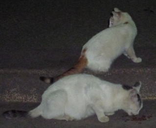 25.真後ろを通る黒白の中猫にビビる白三毛子ちゃん。