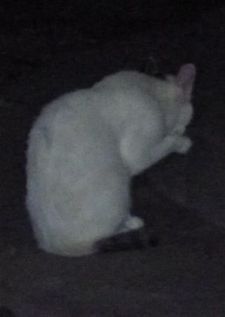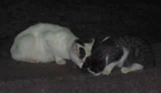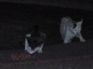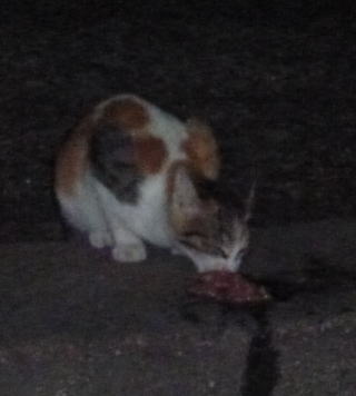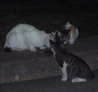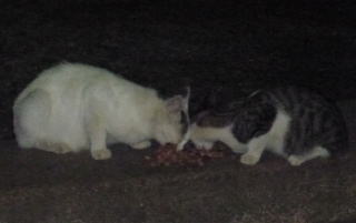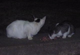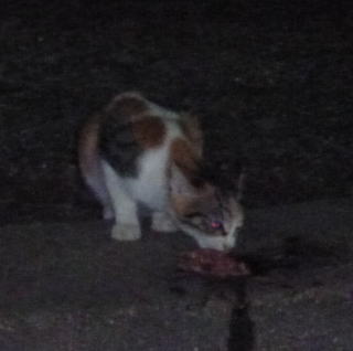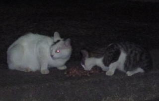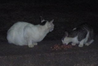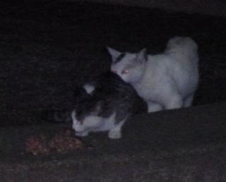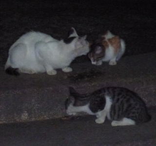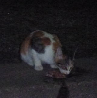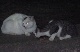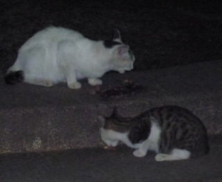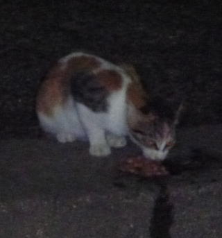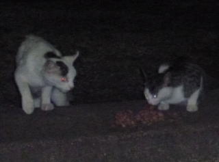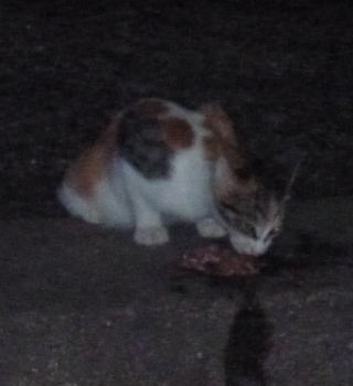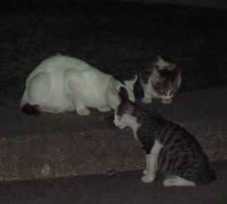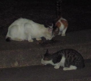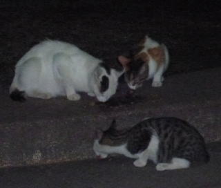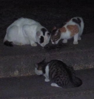 今夜はサバ子ちゃんとフミちゃんのご飯を三毛子ちゃんが横取りする。