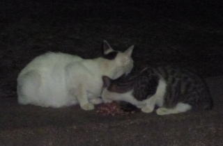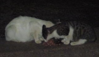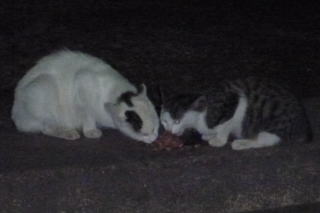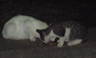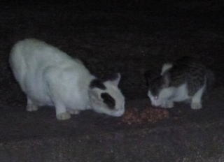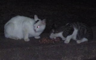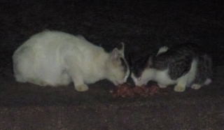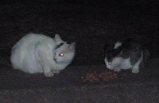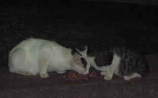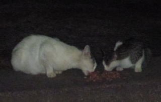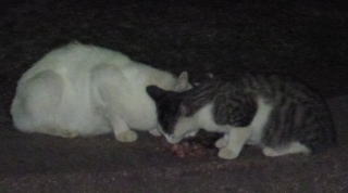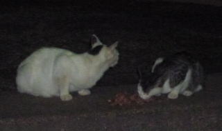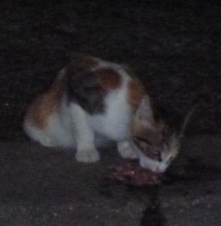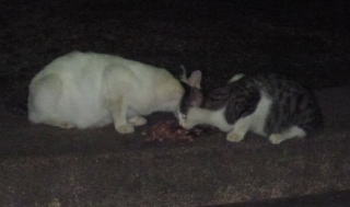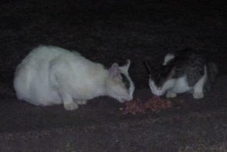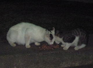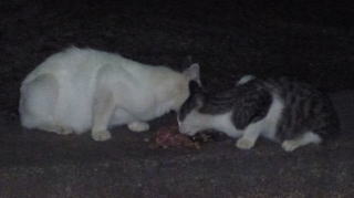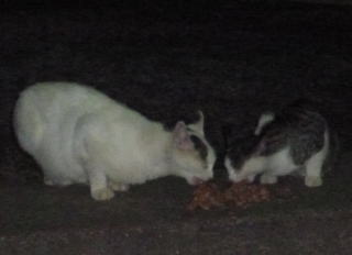 36.リボンちゃんにご飯を横取りされない様に急いで食べる三毛子ちゃん。