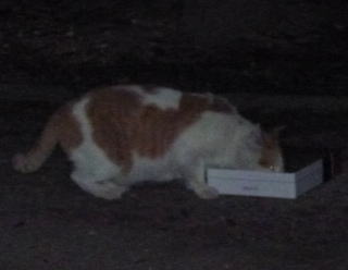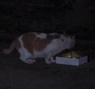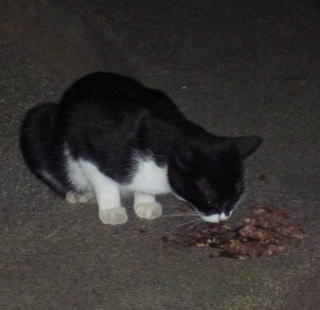 35.相変わらず食事中のサバ子ちゃんと黒覆面の黒猫(オックス)。