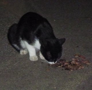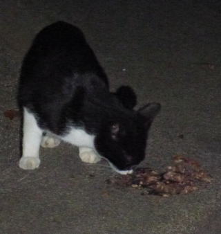 42.食事に夢中の黒覆面の黒猫(オックス)。