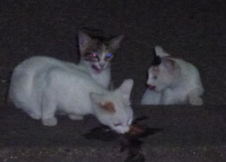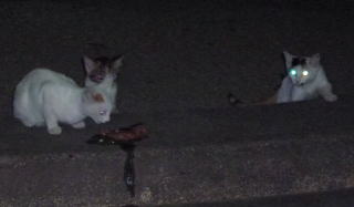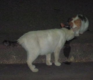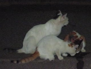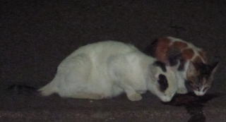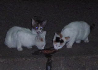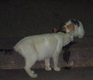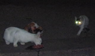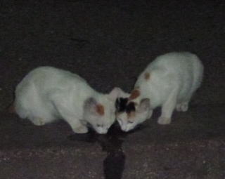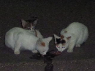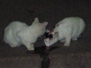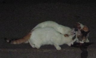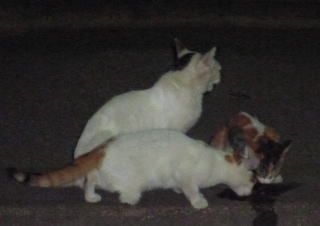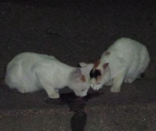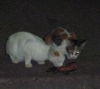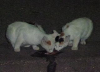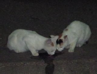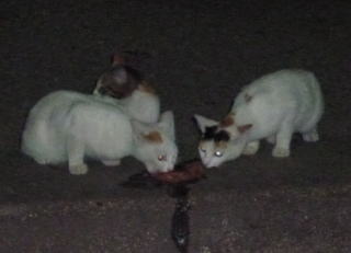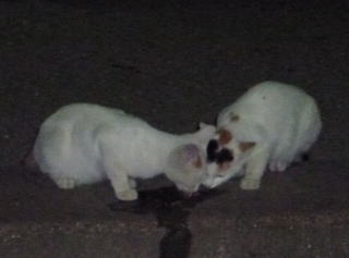 4.ご飯を分け合う白三毛子ちゃんとリボンちゃん。