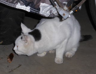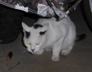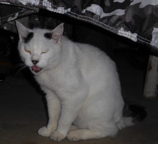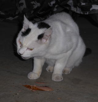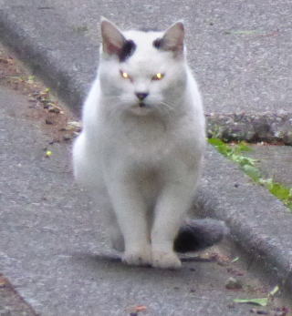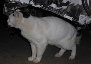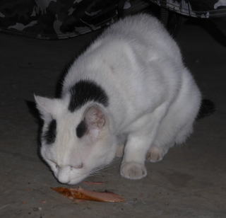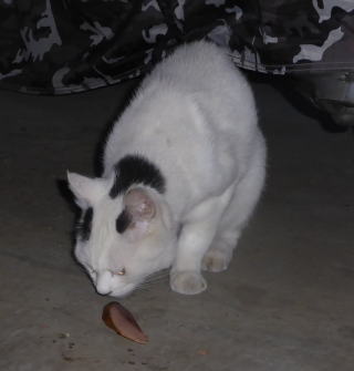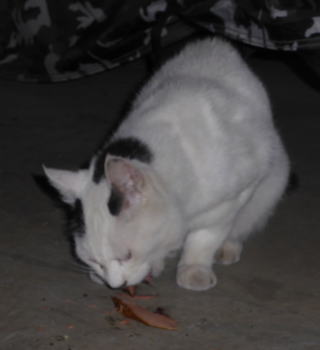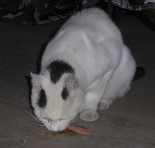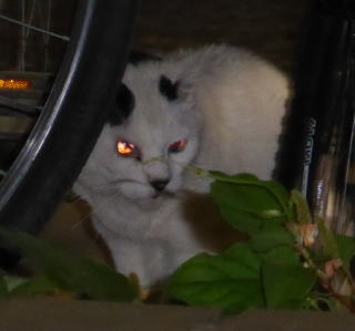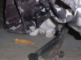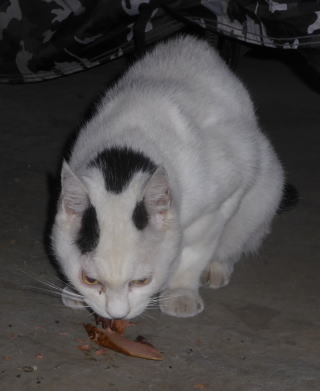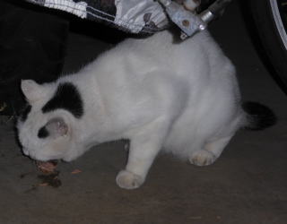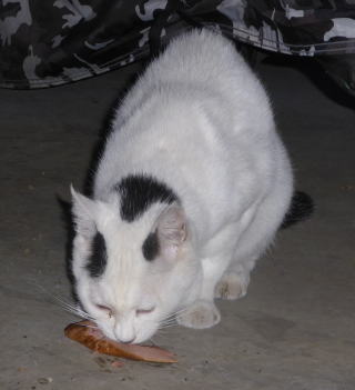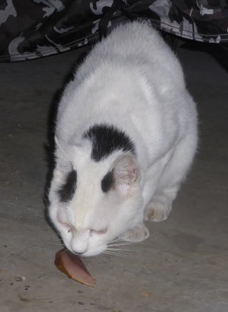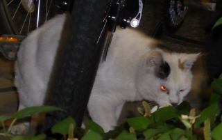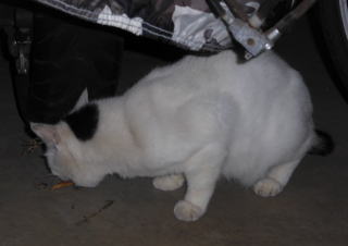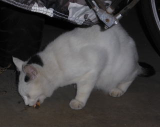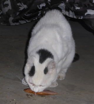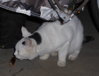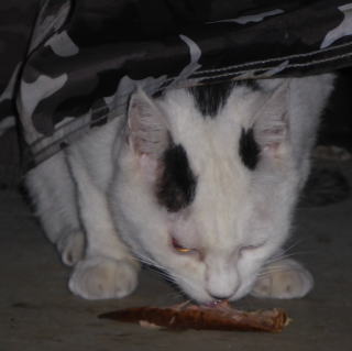 17.自転車小屋のバイク・カバーに隠れ完全防備して焼き鰹を食べるフーちゃん。この時、七枚の写真を撮ったが六枚がピンボケと言う異常事態に...フーちゃんのかたくなな心が引き起こした超自然現象だったのか?そうでなかったのかよく分からない。体格の小さい九郎ちゃんは大口をあけられないので焼き鰹を端から食べるが、巨大なフーちゃんは大口なので焼き鰹を真ん中から食べます。