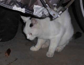 37.フーちゃんがパパを恐れても自転車小屋のバイク・カバーの中なら安心して会ってくれると思うとパパも強制ダッコしてハグしたい気持ちを抑えてフーちゃんに接しています。これこそ真実の愛だ 。