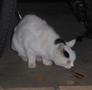 28.パパを警戒しながらも焼き鰹を無心で食べるフーちゃん。