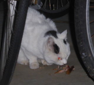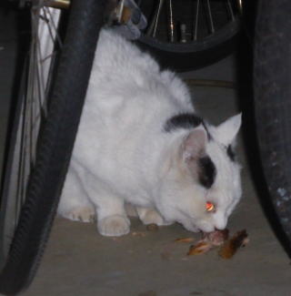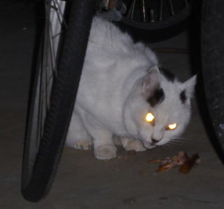 26.自転車の車輪と別の自転車の車輪の間に入って完全防備をして焼き鰹を食べるフーちゃん。