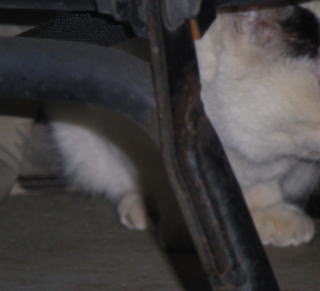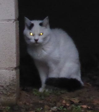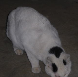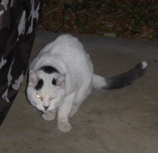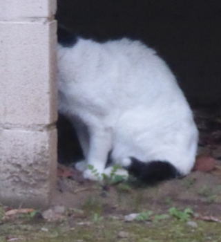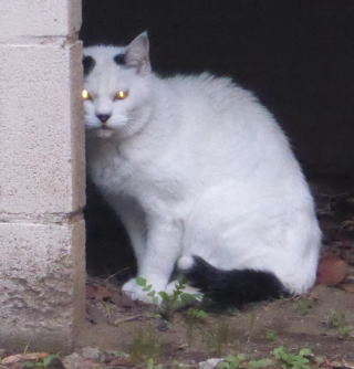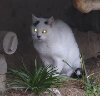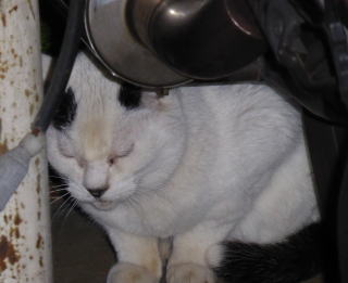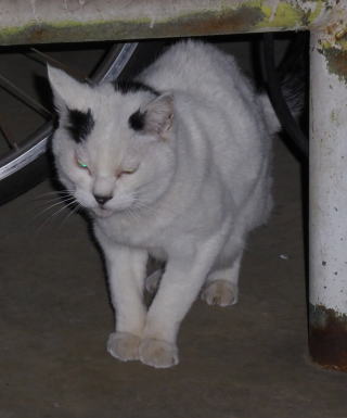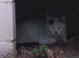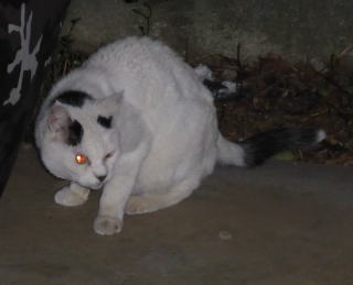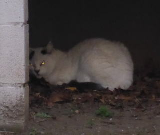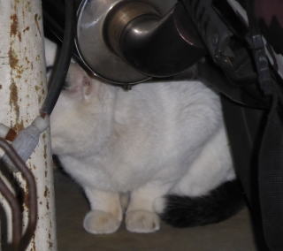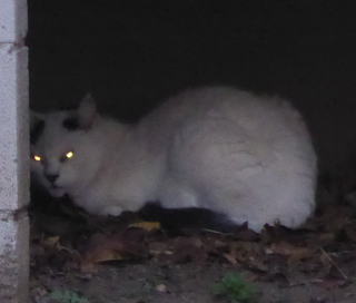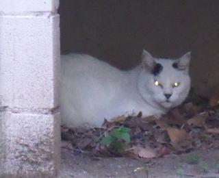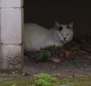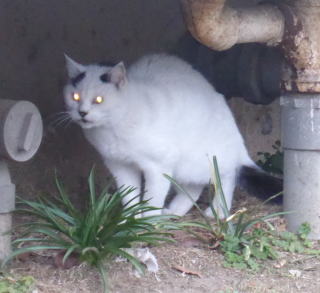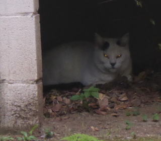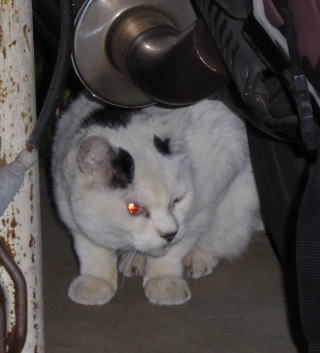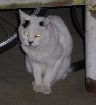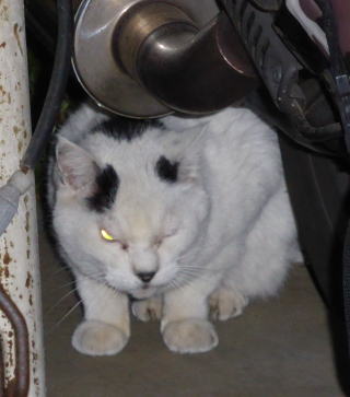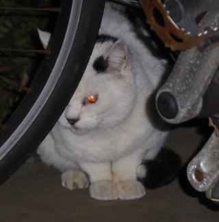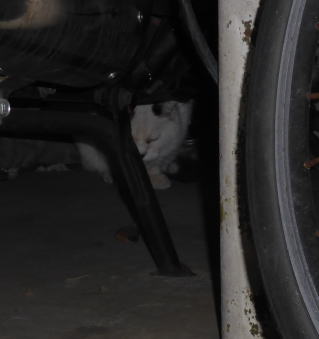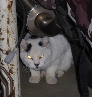 4.昼間は警戒心の強いフーちゃん。夜になってパパと密会する為、自転車小屋に入りました。さらにバイク・カバーに隠れて甘ったれた鳴き声で焼き鰹を催促しました。実際は漆黒の闇の中なのでズーム・アップし過ぎてはみ出してしまいました。