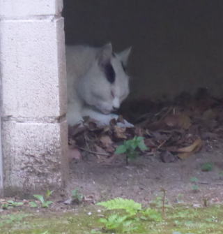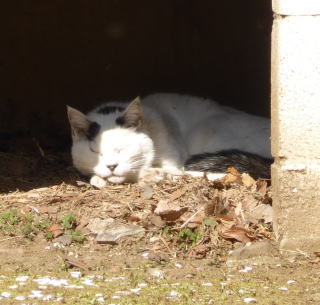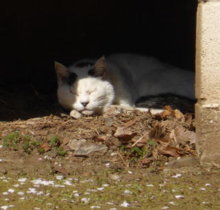 凶暴な九郎ちゃんの縄張りの中に共存しているフーちゃん。フーちゃんはお婆さんになってしまったから九郎ちゃんも無理に追い出そうとしない。また九郎ちゃんが怖いからここへ他の猫は入ってこれない。夜行性の九郎ちゃんが昼寝している時間はフー婆さんも安心して日光浴していられるんだね。