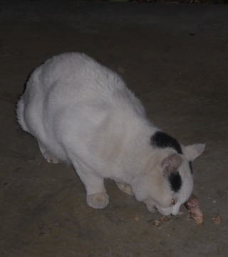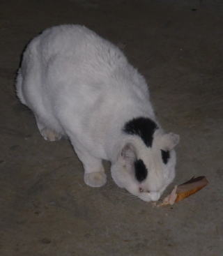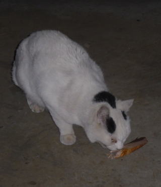 43.フー婆さんが焼き鰹を綺麗に食べている珍しい写真です。