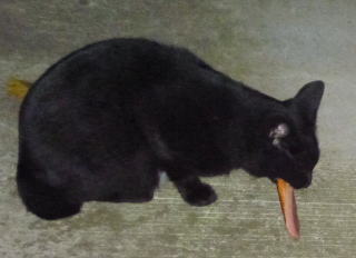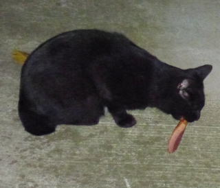 34.焼き鰹を左手でつかむ九郎ちゃん。横顔も彫が深くて耳の位置も日本猫と違う。
