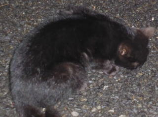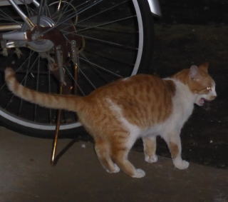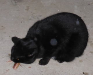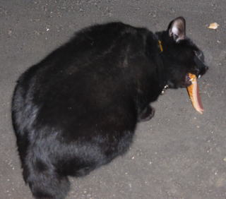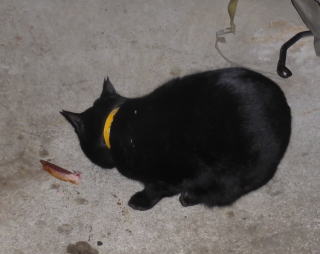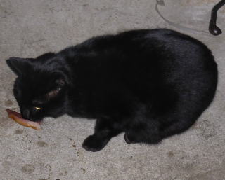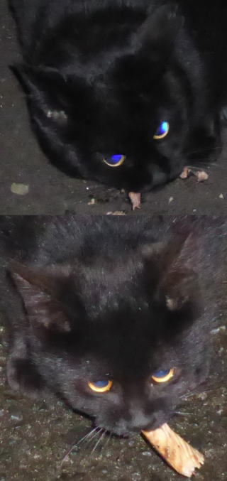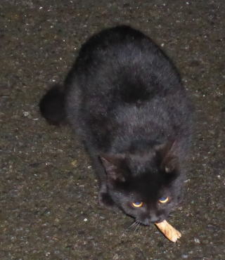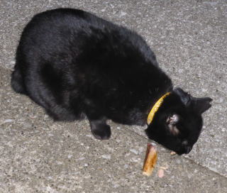 41.黒珍獣ちゃんに焼き鰹を横取りされない様に焼き鰹ををくわえてちょっと移動した九郎ちゃん。