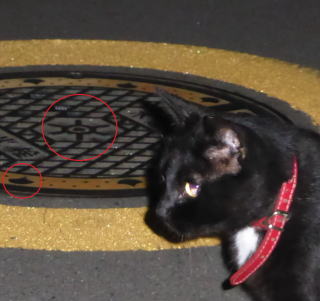 19.九郎ちゃんと三毛珍獣ちゃんの背景にマンホールの蓋が写っています。マンホールの蓋のデザインは自治体毎に違います。よってどこの自治体で撮影されたか特定可能です。撮影場所が特定されると困る場合は背景に場所が特定される様な物が写っていないか注意しましょう。また写っていた場合はモザイクをいれる等の対処をしましょう。背景のマンホールの蓋のデザインは五弁の桜です。「五弁の桜」は東京都・下水道のデザインですから、ここは東京都内だと特定できます。アメリカ系のネコちゃんの九郎ちゃんと三毛珍獣ちゃんは東京都内在住だったんだ。