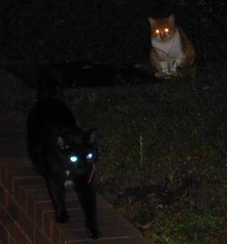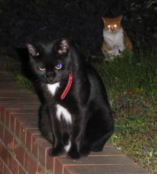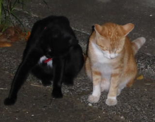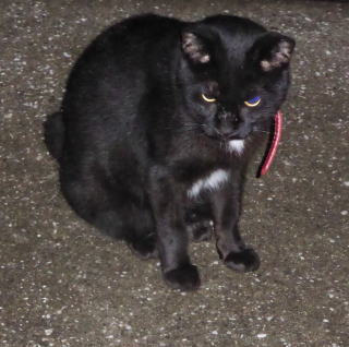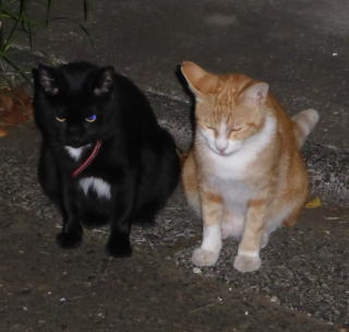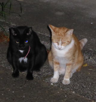 30.九郎ちゃん黒猫でお腹に白毛のエンゼル・マークがあるから人間のタキシードを着ている様で、茶珍獣ちゃんもお腹が白毛なので黄色い柄の入った白いドレスを着ている様にも見えます。