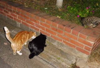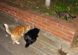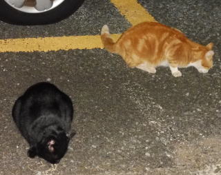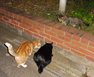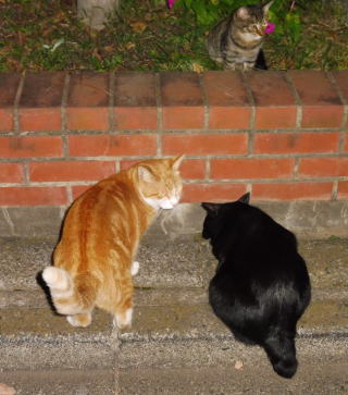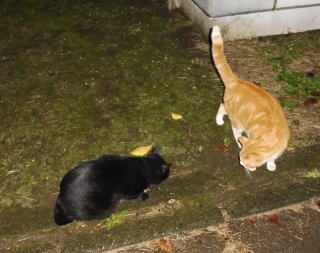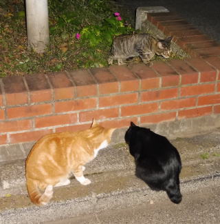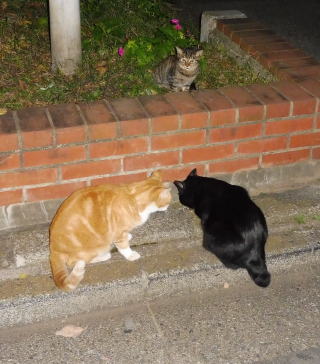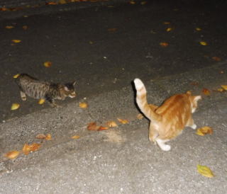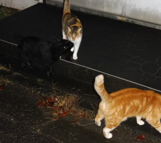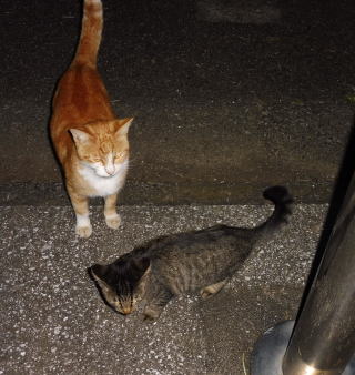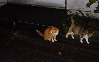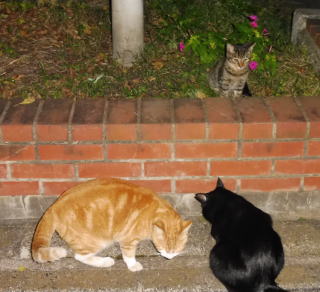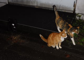 21.仲良く焼き鰹を食べる九郎ちゃんと茶珍獣ちゃんに近寄る(仮名)キジ虎Cちゃん。