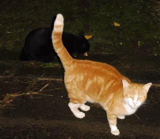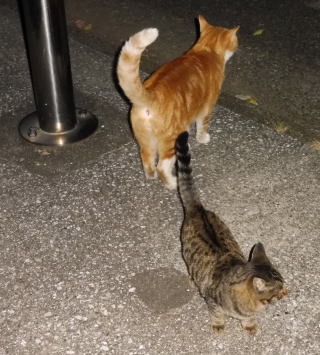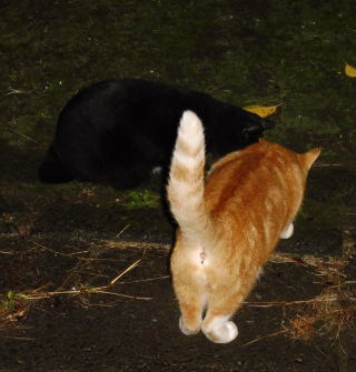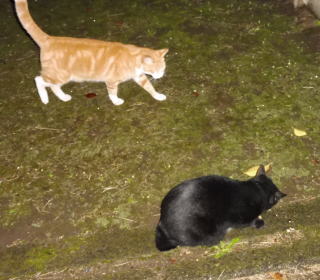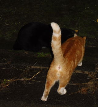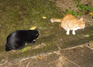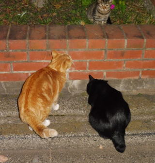 31.立ち去った(仮名)キジ虎Cちゃんを見つめる九郎ちゃん夫婦。キジ虎三姉妹は気になる存在なんだね。