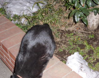 44.数十年ぶりに東京で20cm以上の雪が降った時も九郎ちゃんはパパを待っていてくれた。この画像は残雪の中で寒さをこらえている九郎ちゃん