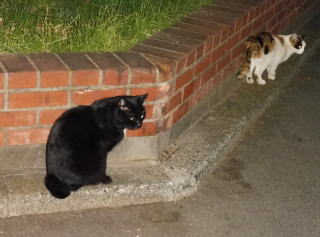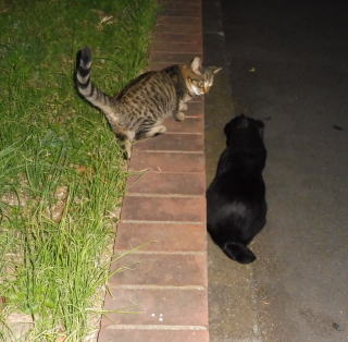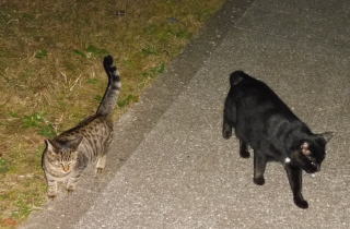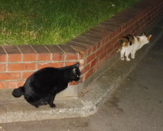 12.九郎ちゃんは昼間もメーン・クーンの自宅の塀の上に乗って(仮名)キジ虎Bちゃんに会いに行っています。この二匹の関係は何なのでしょうか?。