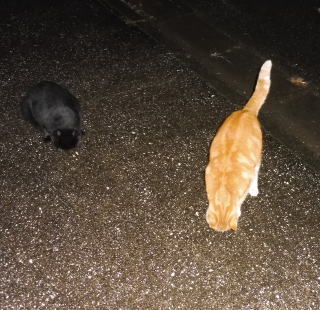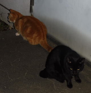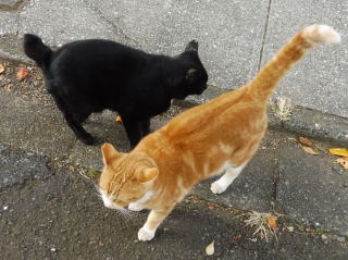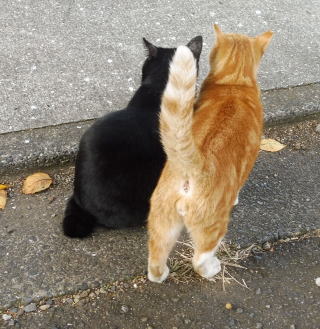 8.九郎ちゃんは(仮名)キジ虎Cちゃんと鼻キッスをした後はこうやって一緒に歩きます。実の子ではないのにこの親密さは何なのでしょうか?九郎ちゃんはロリコンに目覚めたのでしょうか?。