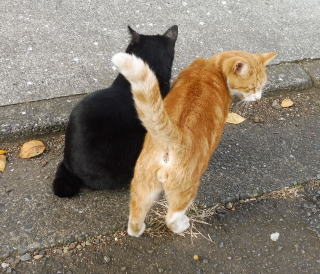 39.発情期の時、雄猫が雌猫の女性器の臭いを嗅いでいるのであれば雌猫の尿に含まれるフェロモンを嗅いでいる事になりますが、発情期以外 で鼻キッスの次に肛門の臭いを嗅いだ時は雌猫の体調を判断していると考えられています。人間に例えると男が女の肛門の臭いを嗅いで「今日は元気だね」とか「今日は体調悪いの?」と言っているのです。パパも人間の女に同じ事をやってみたい。