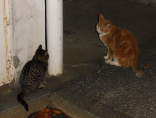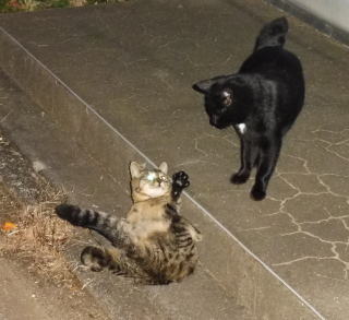 45.自転車小屋で戯れる(仮名)キジ虎Bちゃんを見つめる九郎ちゃん。