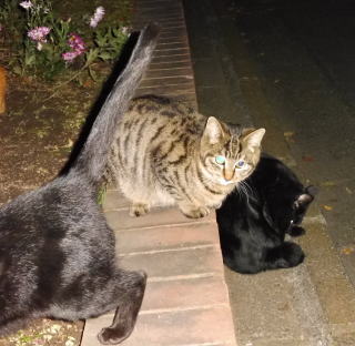 7.ロリータ少女のキジ虎Cちゃんは妻の茶珍獣ちゃんと夫の九郎ちゃんの間に割って入る様になりました。因みに左の黒猫は黒猫Cちゃんで九郎ちゃんではありません。