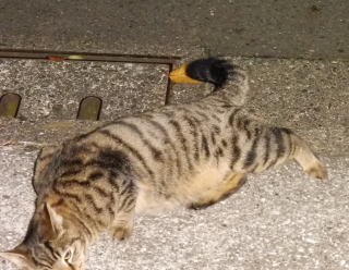32.こうやって焼き鰹を丸呑みした時に満タンな胃を刺激したのか焼き鰹を丸ごと吐き出し、さらに大型の缶詰二個分のキャット・フードを吐き出しました。こんな沢山の食事は与えていません。九郎ちゃんは複数の家に通い猫して胃が満タンになるまで食事をしていた様です。なんて野郎だ。パパは激怒します。