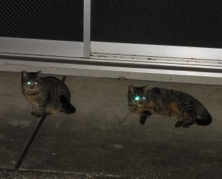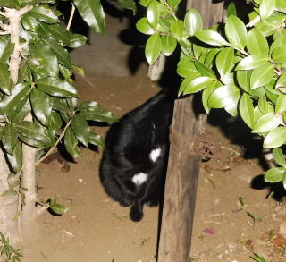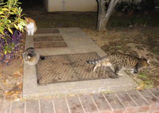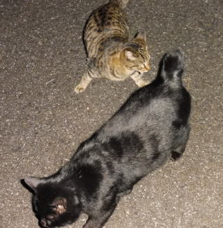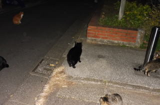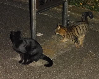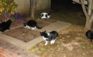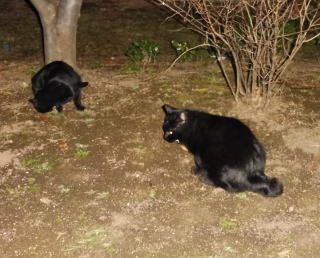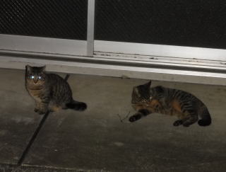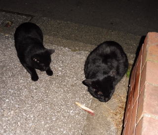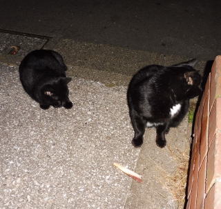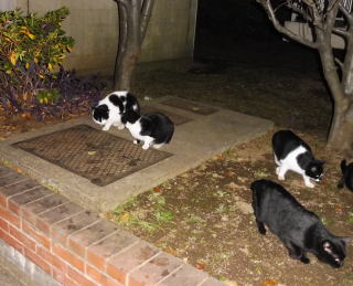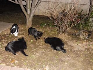 36.また別の夜に左からカンカンちゃん、まだ名前のない雌猫ちゃん、黒白猫Bちゃん、黒ポン太ちゃん、黒猫Bちゃんが黒タヌキを親父狩りして「タヌキ汁」を食べようとやってきました。