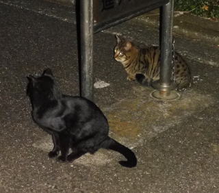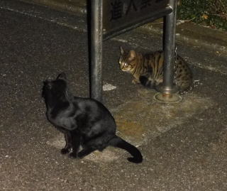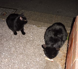 20.「あれ。九郎ちゃんが二匹いる」とパパは思いました。それとも黒タヌキの親子なのでしょうか?実際は右が九郎ちゃん。左が黒猫Cちゃんです。まだ東京の都心部にタヌキがいると確認されていませんが郊外の世田谷区等ではタヌキの目撃例が後を絶ちません。更にその先の川崎市や横浜市の田園都市線の沿線では本格的に開発される前の昭和40年代まで住民とタヌキとの交流が確認されています。現在でも開発と言っても山肌を切り開いただけの土地で、昨日、タヌキ?白鼻芯?ムジナ?を見たよ。と言う証言が後を絶ちません。東京からわずか数十kmの山間部にタヌキが生息する訳ですから、東京都心部に未確認ながら黒タヌキの親子が生息していると言っても事実の捏造までは言えないでしょう。