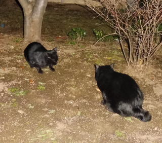 26.直接的な血縁関係はなくとも(架空種)黒ヌタキの親子として九郎ちゃんの縄張りに黒猫Cちゃんが来ると挨拶したり、九郎ちゃんは茶子ちゃん一派のネコ集会に参加して黒猫Cちゃんの顔を見にいく様になりました。直接的な血の繋がりはなくても気になる存在の様です。