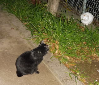 37.九郎ちゃんと犬猿の仲の百合子ちゃんは九郎ちゃんが茶子ちゃん一派のネコの集会に女狩りに来る事を不快に思っています。九郎ちゃんが茶子ちゃん一派のネコの集会から離れて、自分の縄張りに戻って行く様子を尾行して確認しに来た様です。