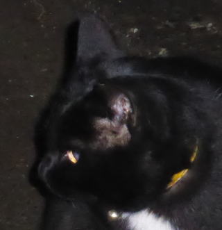 これは九郎ちゃん10の49の画像です。これは去年の発情期の九郎ちゃんの頭部の画像です。嫌がる雌猫のお尻の匂いを嗅ごうして(雌猫の爪出しネコ・パンチの反撃に遭い)頭部を負傷しました。