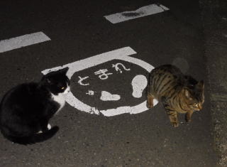 4.「止まれ」の標識の前ではキジ虎Cちゃんが九郎ちゃんを親父狩りしようと虎視眈々と狙っています。