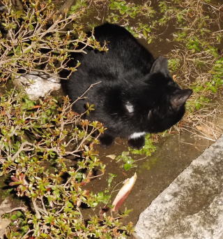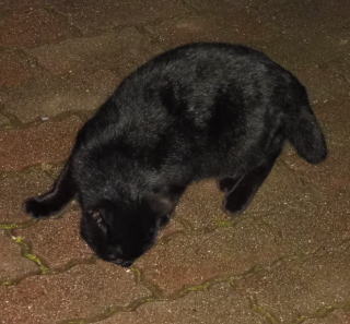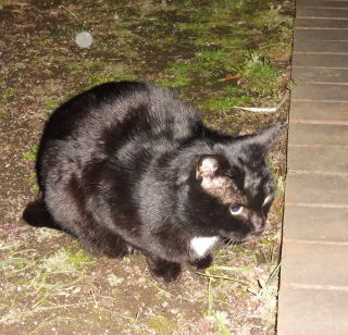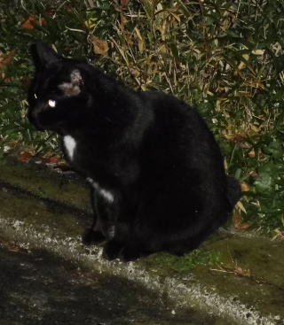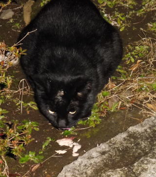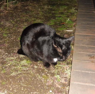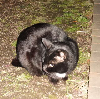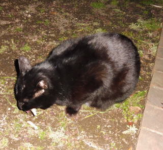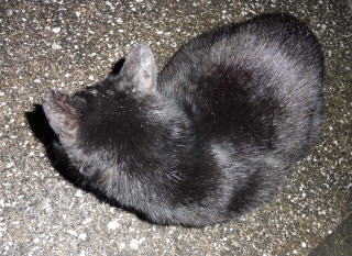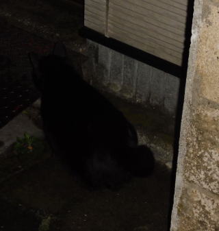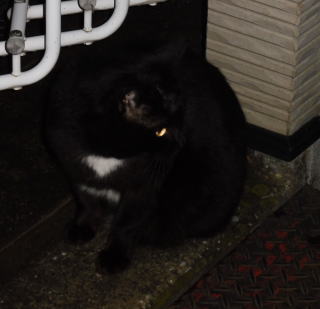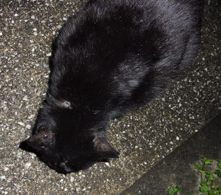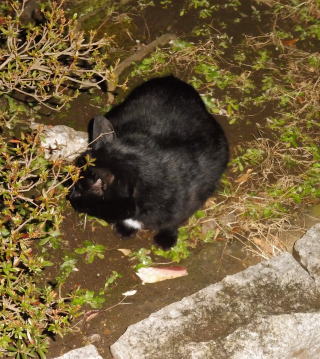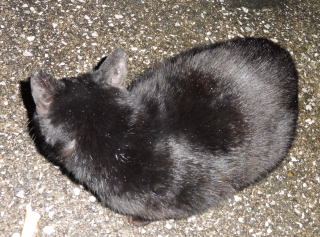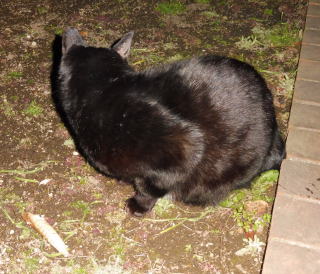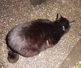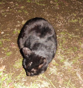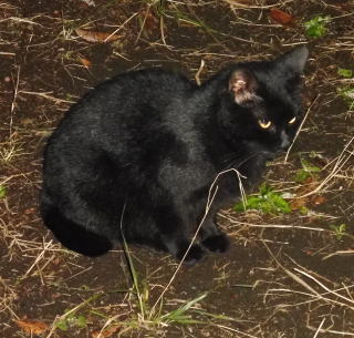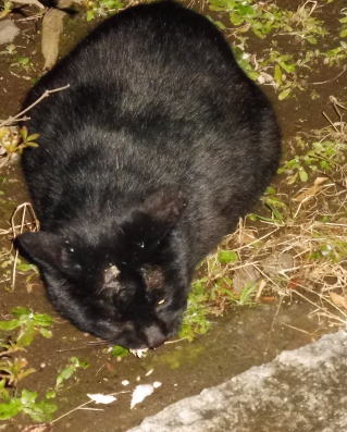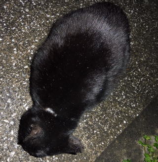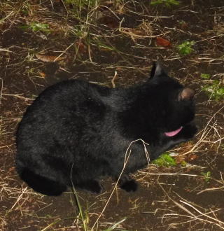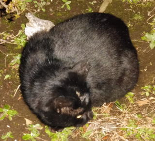23.「黒ポン太ちゃん」は背中を丸めると前後を押し潰れた様な体形の九郎ちゃんに良く似ていますが、こうやって普通にしていると胴長な黒猫三姉弟に見えます。「黒ポン太ちゃん」は黒猫Cちゃんが化けた生物だったんだ。