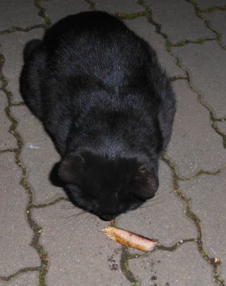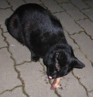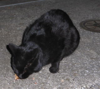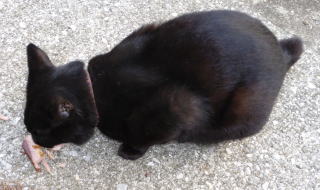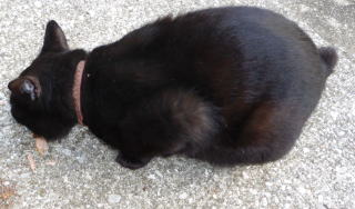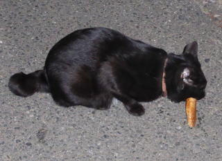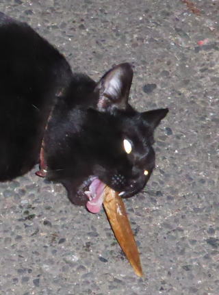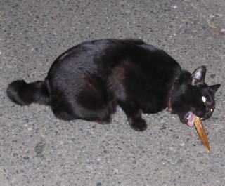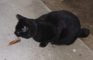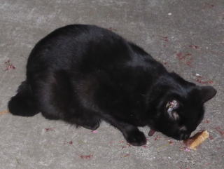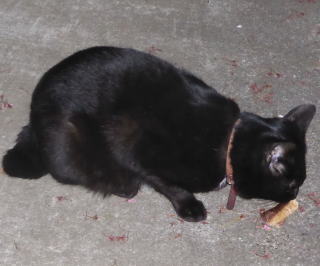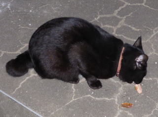 28.枯れた桜の花びらの上で焼き鰹を食べる九郎ちゃん。
