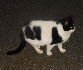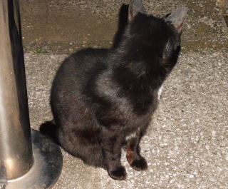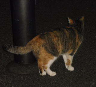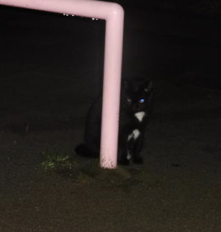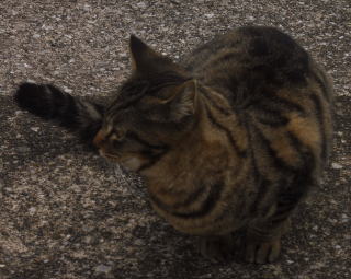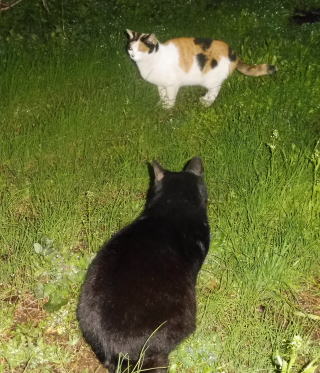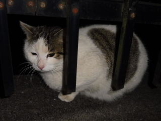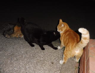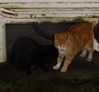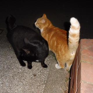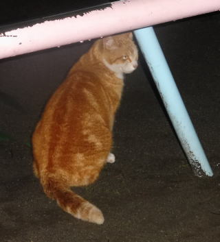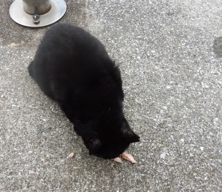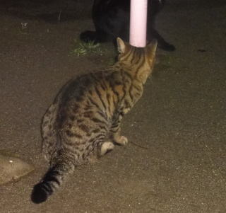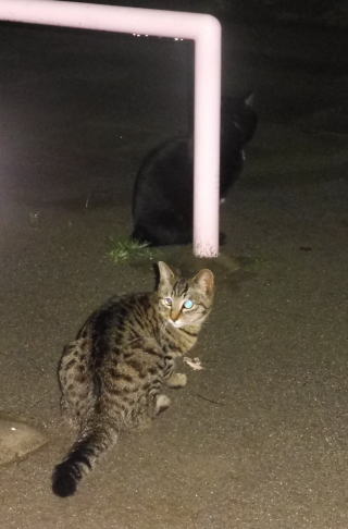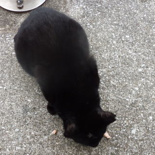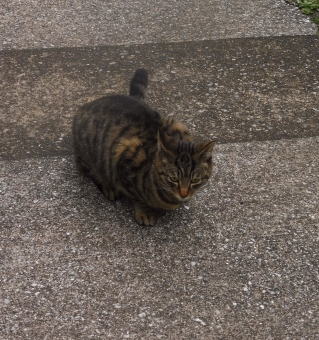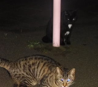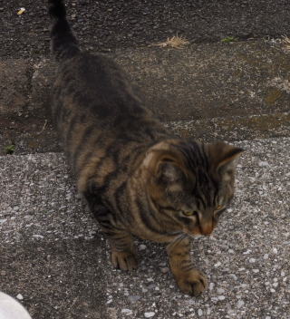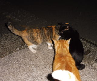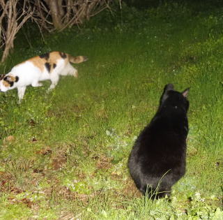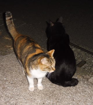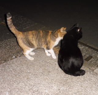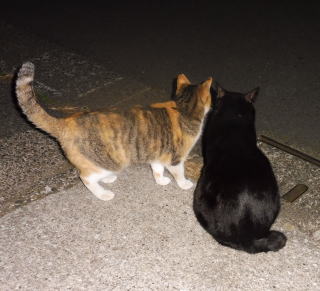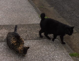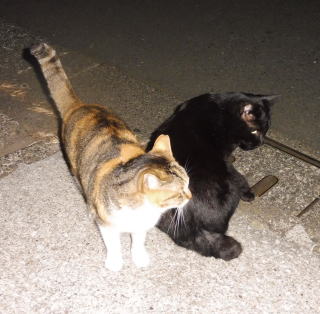 26.この地域のネコちゃんは家猫ちゃん、野良猫ちゃんを問わず皆、仲良しですが、例外の二匹が今、ここで遭遇してしまいました。一匹目はパパの馬鹿息子の九郎ちゃんです。九郎ちゃんに遭遇したネコちゃんは猛ダッシュで襲われるか、雌猫なら強制的にお尻の匂いを嗅がれるかのどちらかです。もう一匹は泥棒猫です。パパが平等に焼き鰹を与えているにも関わらず、猛ダッシュで焼き鰹を奪い逃げて行きます。九郎ちゃん。泥棒猫を退治して平安をもたらしてください。